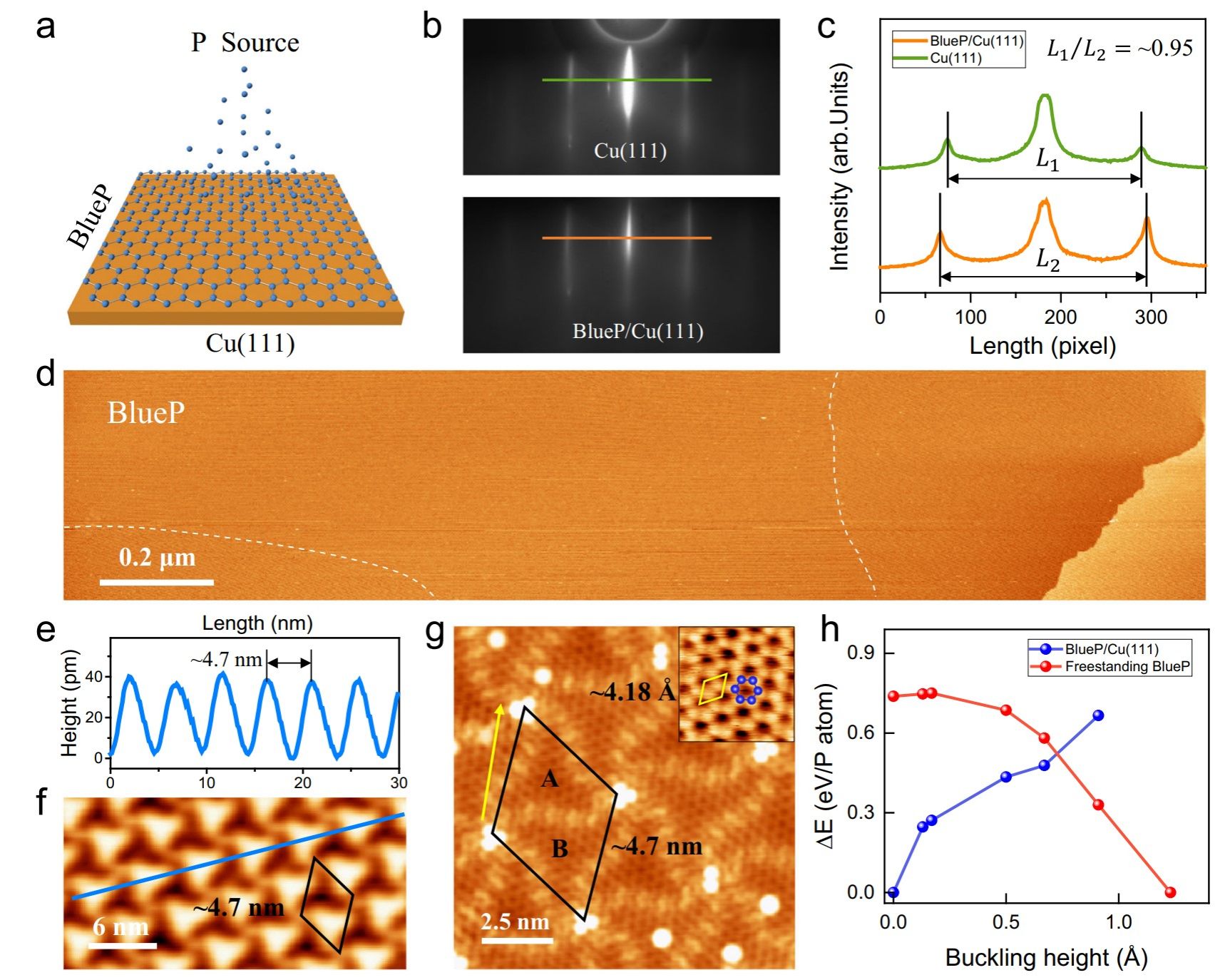 蓝磷烯(BlueP)是一种理论预言的具有屈曲蜂窝晶格的单层磷同素异形体★,由于具有宽的带隙和优异的电学性质而受到关注★。密度泛函理论计算研究表明,在拉伸应力下,屈曲的BlueP可以转变为像石墨烯那样超平坦的蜂窝晶格,并在费米能级附近出现线性色散的能带,成为一个新的狄拉克费米子系统。手性材料打破了镜像对称性,对入射的左手或右手偏振光可表现出不同的响应★,在光电子★、自旋(谷)电子学和手性催化中具有潜在应用前景。手性石墨烯已经在扭曲的双层石墨烯系统中实现,并表现出强的圆二色性。因此,在BlueP中实现手性可以进一步丰富其物理和化学性质★,拓展其潜在应用。由于缺乏对应块体材料,BlueP只能通过自下而上的方法获得★。最近的一项研究工作表明★,BlueP可以通过半层半层生长机制在GaN(001)上合成★,几个实验小组利用分子束外延技术在Au(111)、Ag(111)、Cu(111)和氧化铜衬底上也生长了纳米尺寸BlueP。然而,仍未有理论和实验上关于大面积超平坦手性BlueP生长的工作报道★。